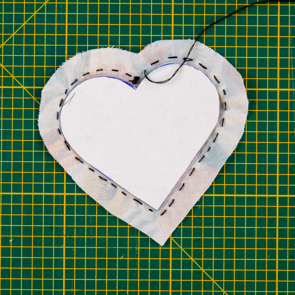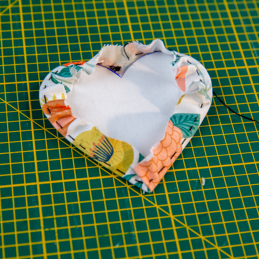 Step 4: Sew Along the Heart Shape – Stitch along the drawn heart line, inserting a slightly smaller cardboard heart inside to maintain shape.