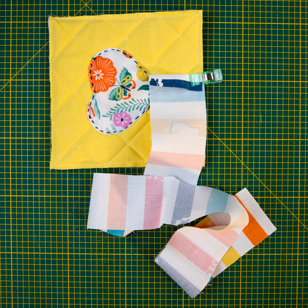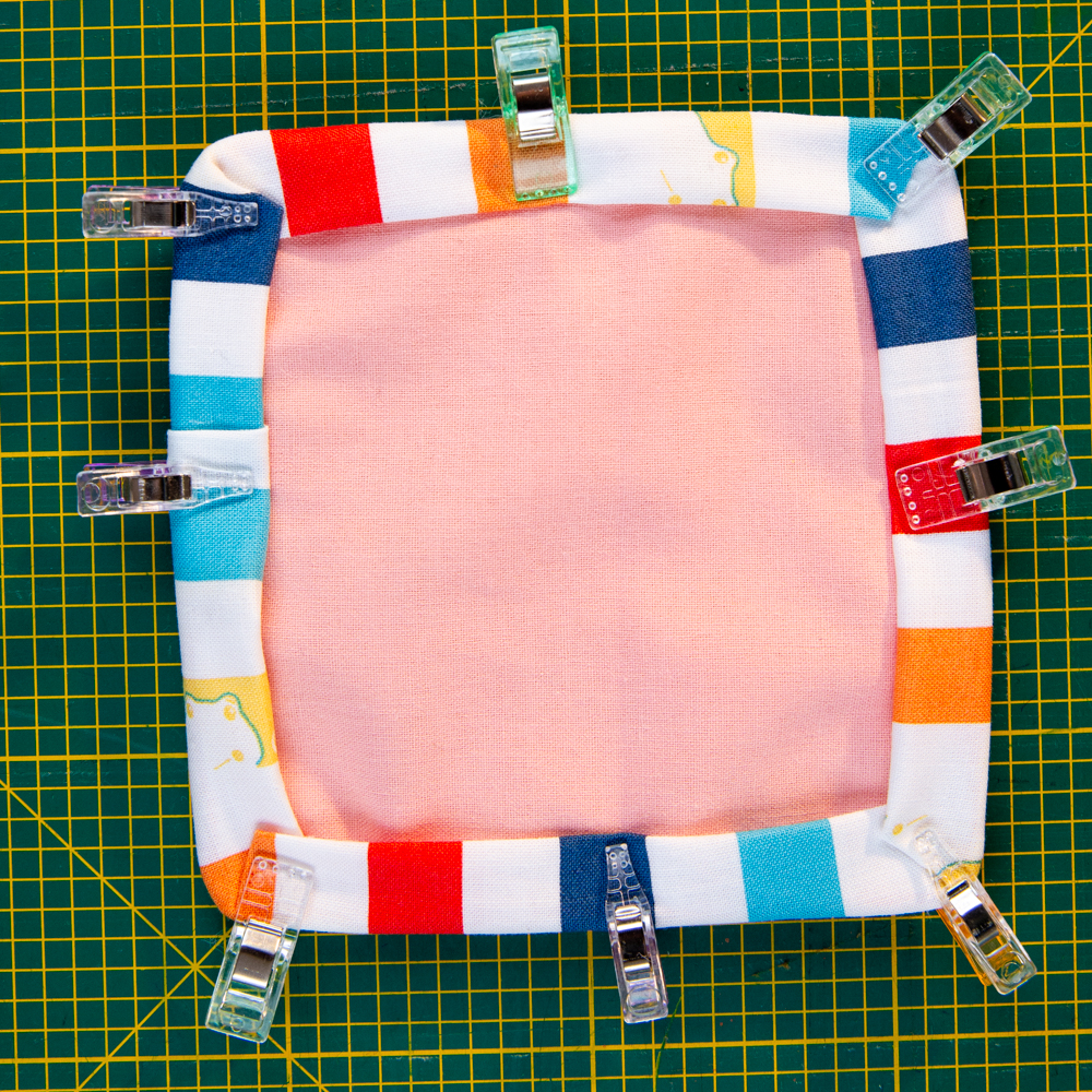 Step 9: Fold and Secure the Border – Fold the strip to the back, then fold it inward once more. Use clips to hold it in place.