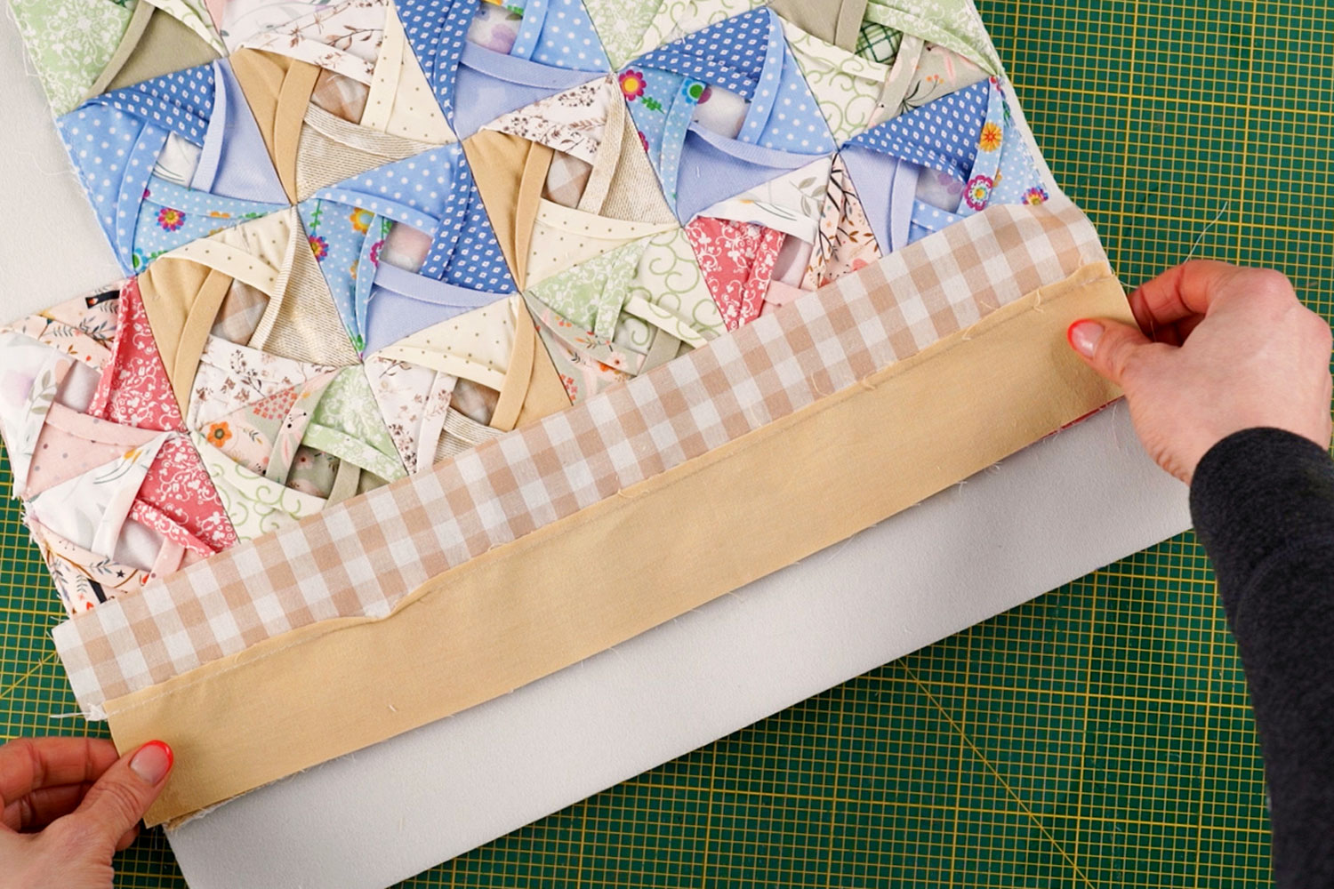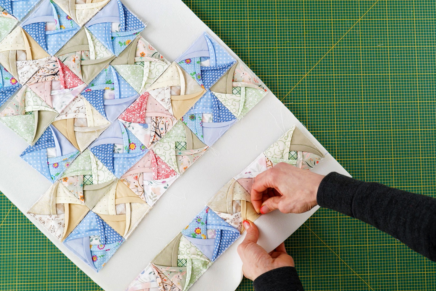 Once the blocks are sewn into rows, attach them one row at a time onto a foam board. Sew each row securely onto the foam to provide structure and stability.
