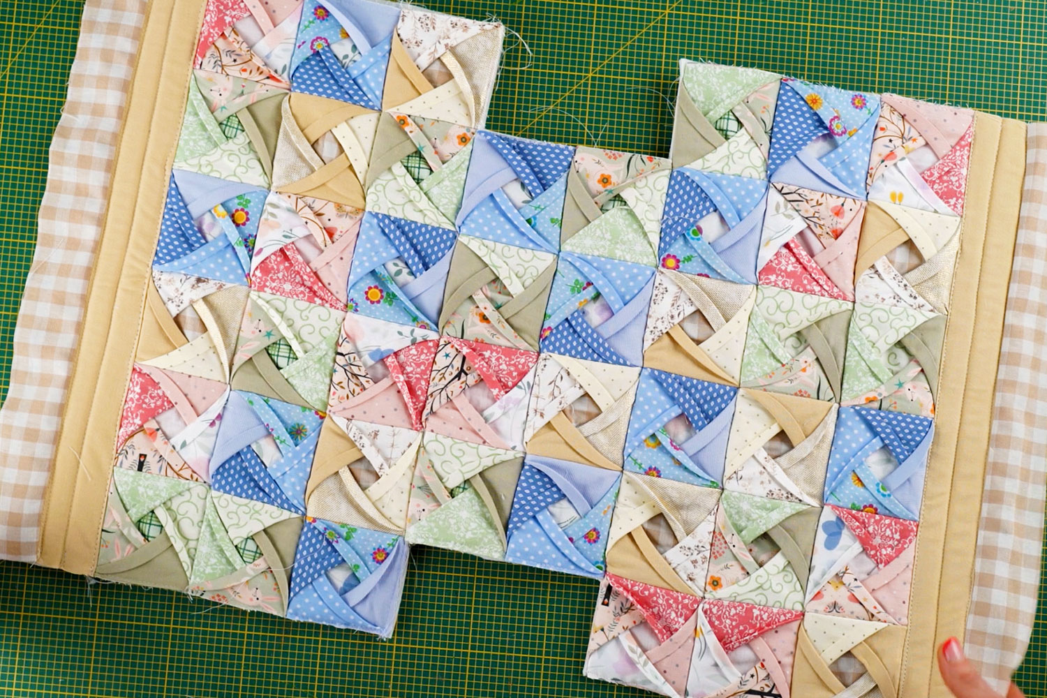 Once all blocks are prepared, start sewing them together in rows. 6 rws with 6 blocks and 2 rows with 4 blocks. Arrange them in a design that you like, ensuring the patterns are evenly distributed. Sew the blocks together with a straight stitch, joining row by row.